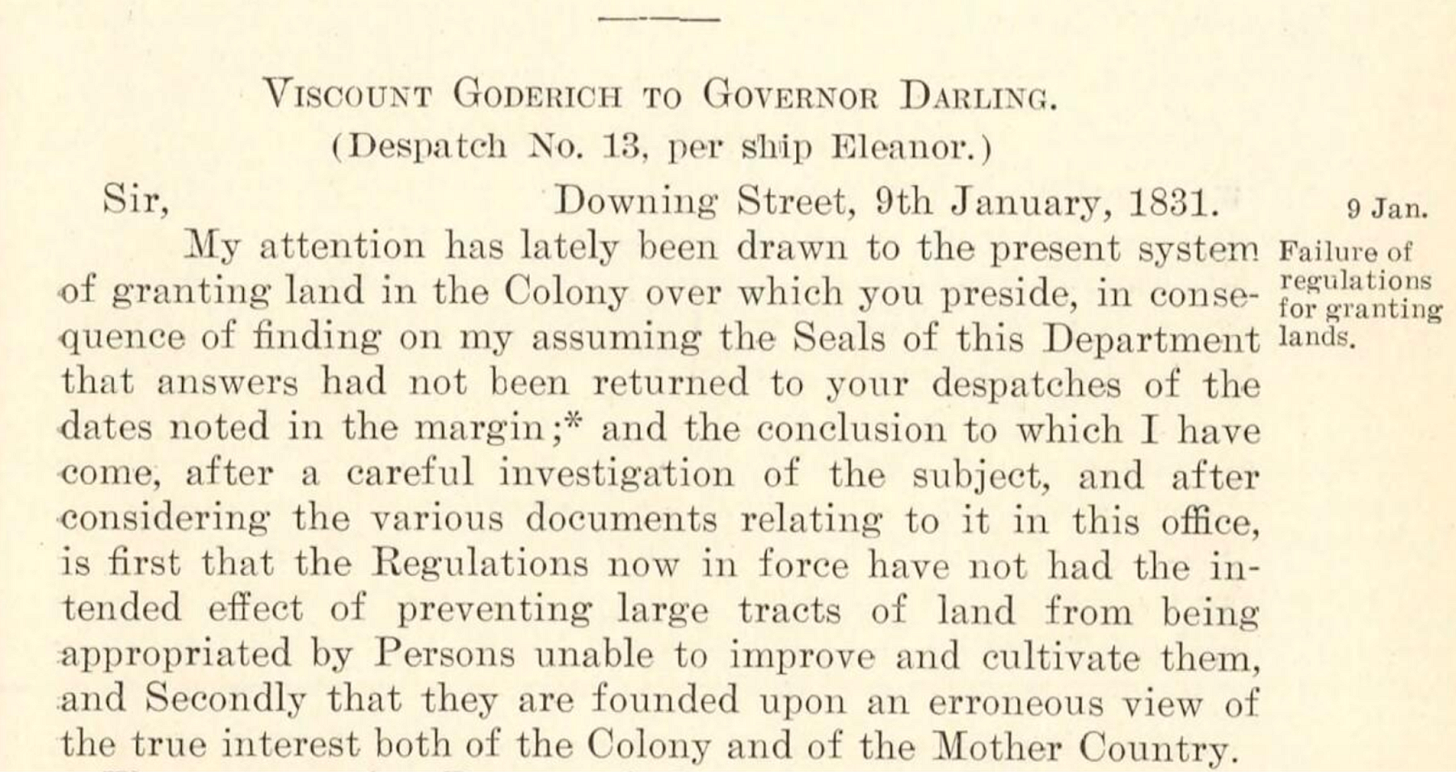 Previous Prime Minister of the United Kingdom Viscount Goderich was serving as Colonial Secretary at the time. And so it was within his purview to issue a despatch to the colony, expressing dismay at the way land was being allocated and offering a correction.