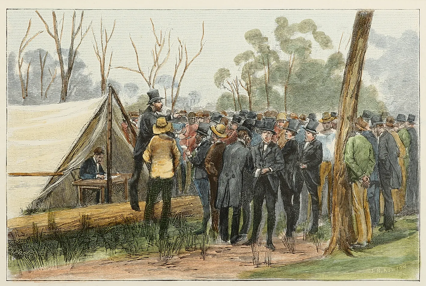 People started hanging out at auctions almost immediately, and as the majority of auctions moved from the Crown to the private market, the spectacle remained. Per Dr Richard Gillespie for Museums Victoria: