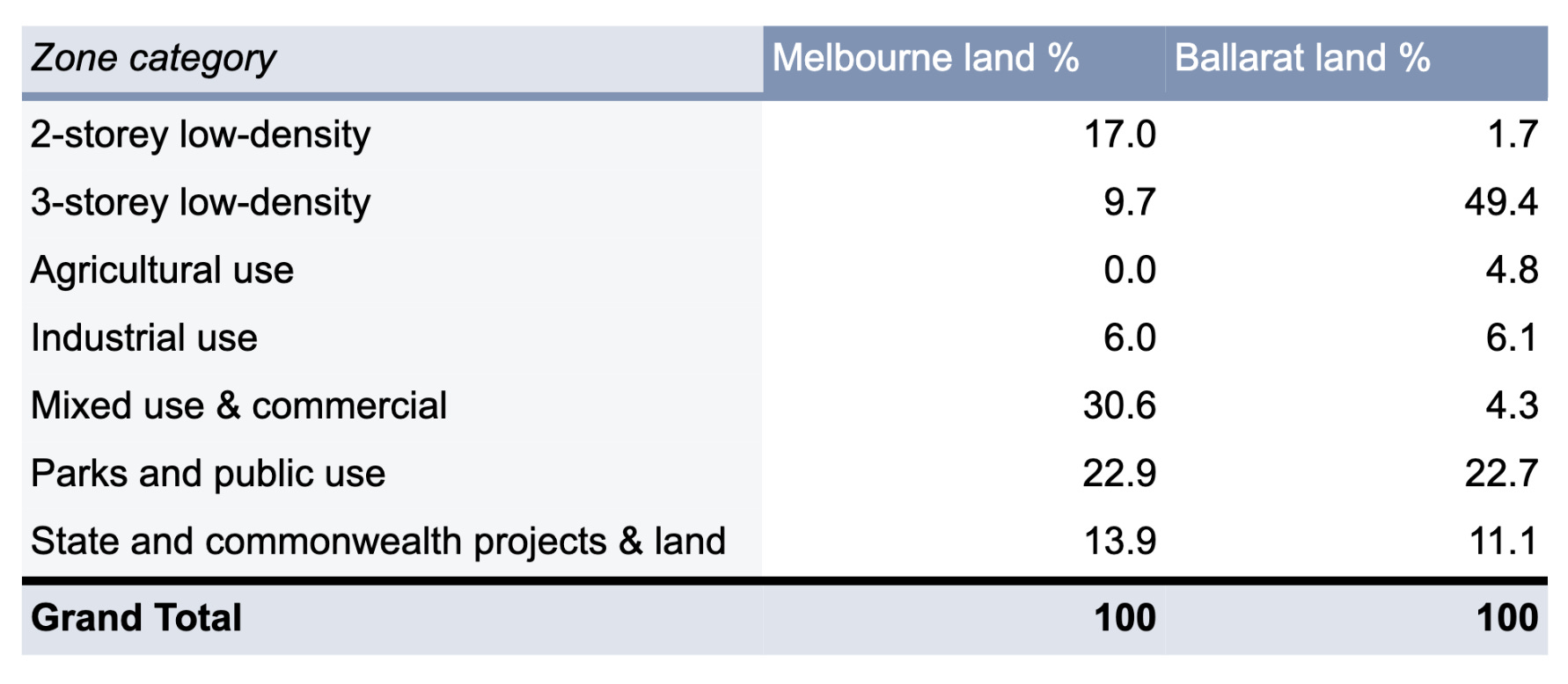While Melbourne and Ballarat allocate similar amounts of land to industrial use, Melbourne enables mixed-use and commercial development on more than 30% of its land. Ballarat allows the same on just 4%.