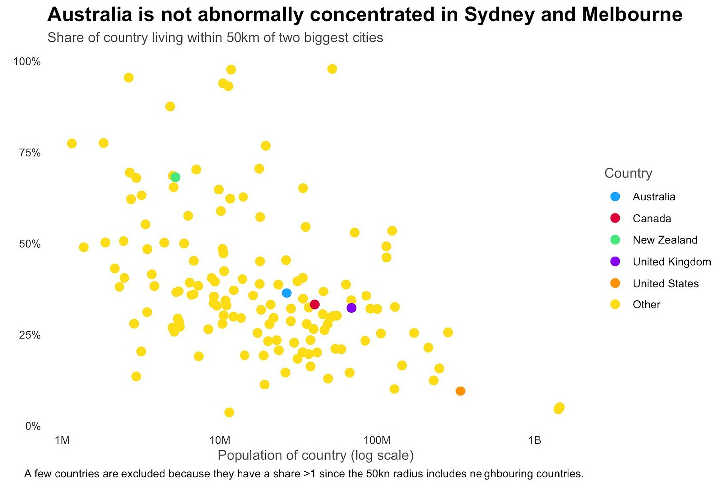 Let’s say you’re unconvinced by the above, and still think we need new cities. You may, for instance, be under the impression that Australia has relatively few sizeable cities compared to peer nations. But this is also not really the case.