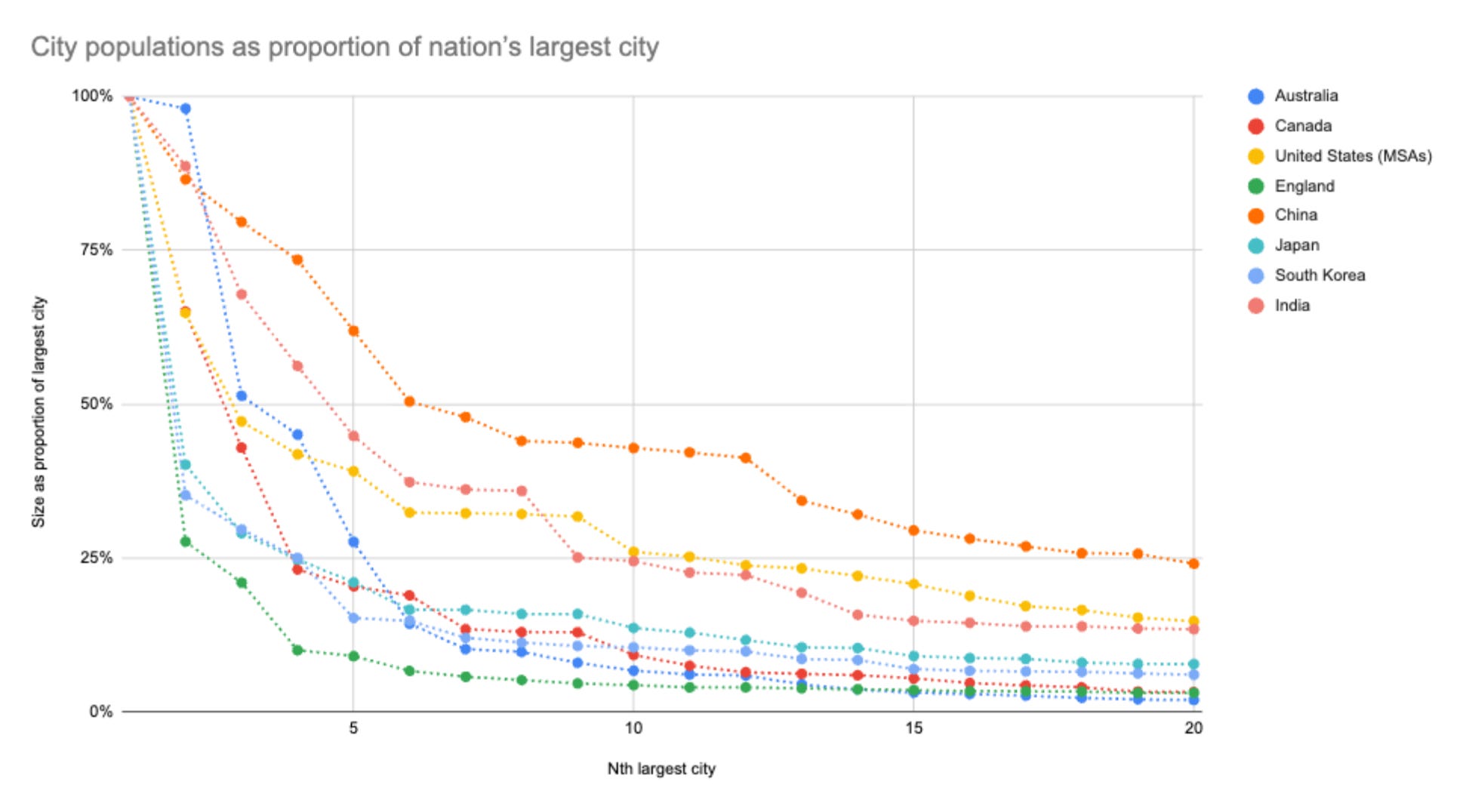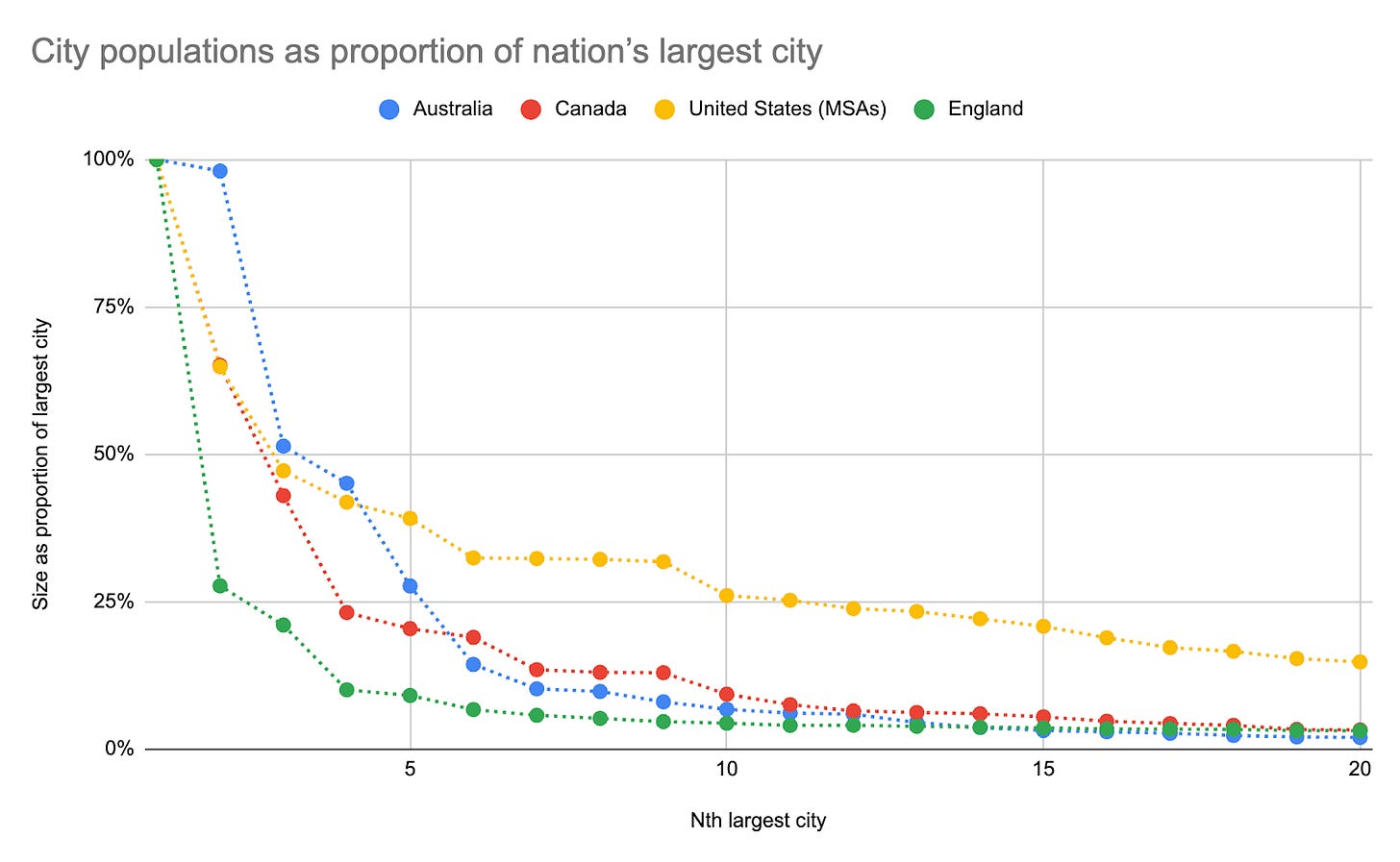 In the chart above, you can see that Sydney and Melbourne are very close to each other in size—but that the following drop-off in Australian city size is not all that precipitous.