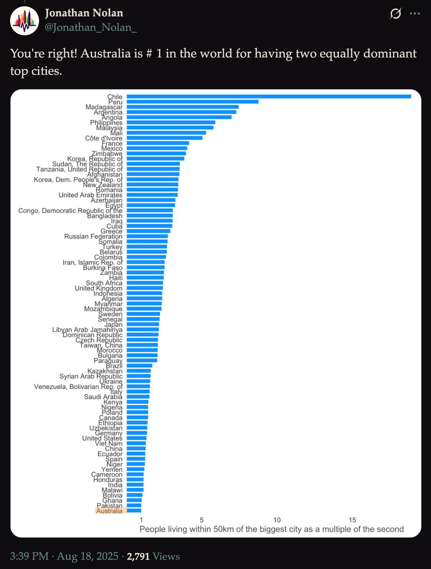 One mildly interesting fact is that because Sydney is only 1.03× the size of Melbourne, Australia’s top-two cities are most similar in size when compared to any other top-two city pairs internationally.